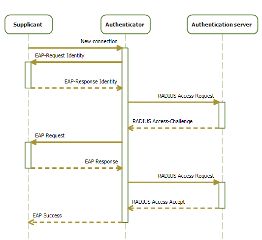 • autentikátoru pak posílá zpět data, zda je suplikant do sítě povolen, případně i s nastaveními, např. přístupu, které by měly platit pro něj